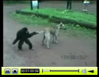 Обезьяна к собаке пристаёт.